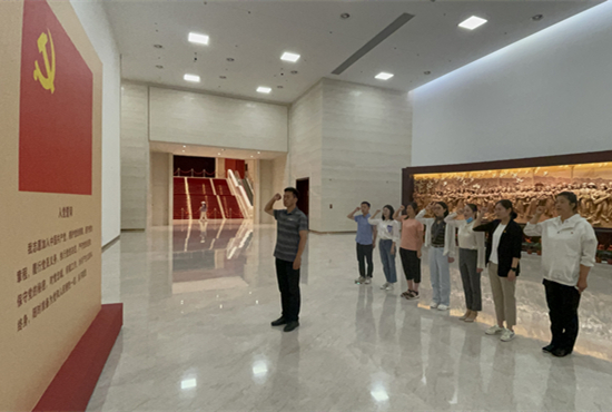 在党史展览馆宣誓厅,面向鲜红的中国共产党党旗,全体党员同志重温入党誓词。